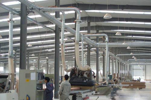 南陽某家具廠生產過程中會產生大量的木材粉塵,粉塵飄散在車間,污染環境,危害員工身體健康。鑒于客戶車間面積大、機器設備多、塵源點多的情況,四明環保給該客戶設計了整體解決方案——木工中央集塵系統,經過現場勘查討論決定安裝一套PH-360布袋除塵器。該除塵器除塵效率高,可捕集粒徑大于0.3微米的細小粉塵,除塵效率達99%以上;結構簡單,運行穩定,投資較小,維護方便。